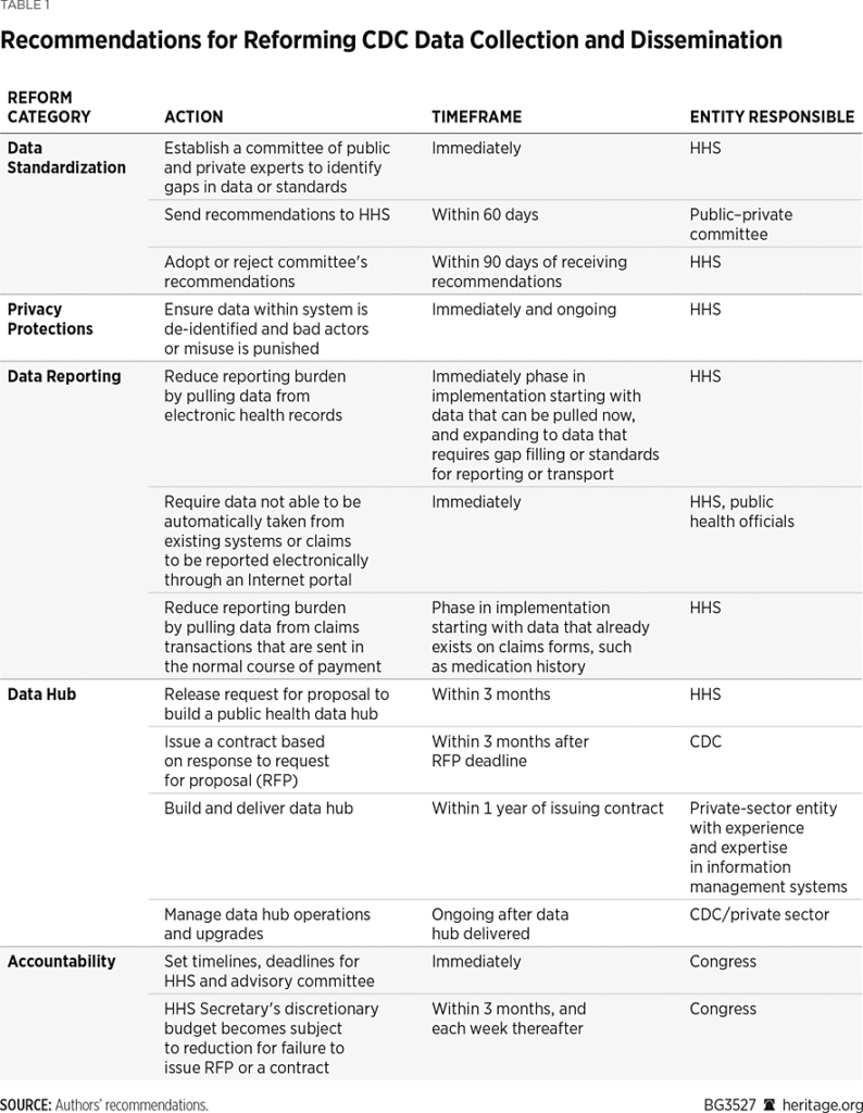 Summary: The COVID-19 pandemic has revealed the disastrous public health consequences of the Centers for Disease Control and Prevention’s (CDC’s) failure to follow multiple congressional mandates to modernize its data infrastructure. Current reporting methods are burdensome for frontline medical workers, yet result only in fragmented data that is not available in real time or usable across systems. Congress should require the HHS to prioritize the electronic collection and dissemination of robust, privacy-protected data that better leverages existing systems while reducing burdens on clinicians. The HHS should also quickly enter into a public-private partnership with a data management expert to develop a system that makes critical information available to health care workers and policymakers in real time.